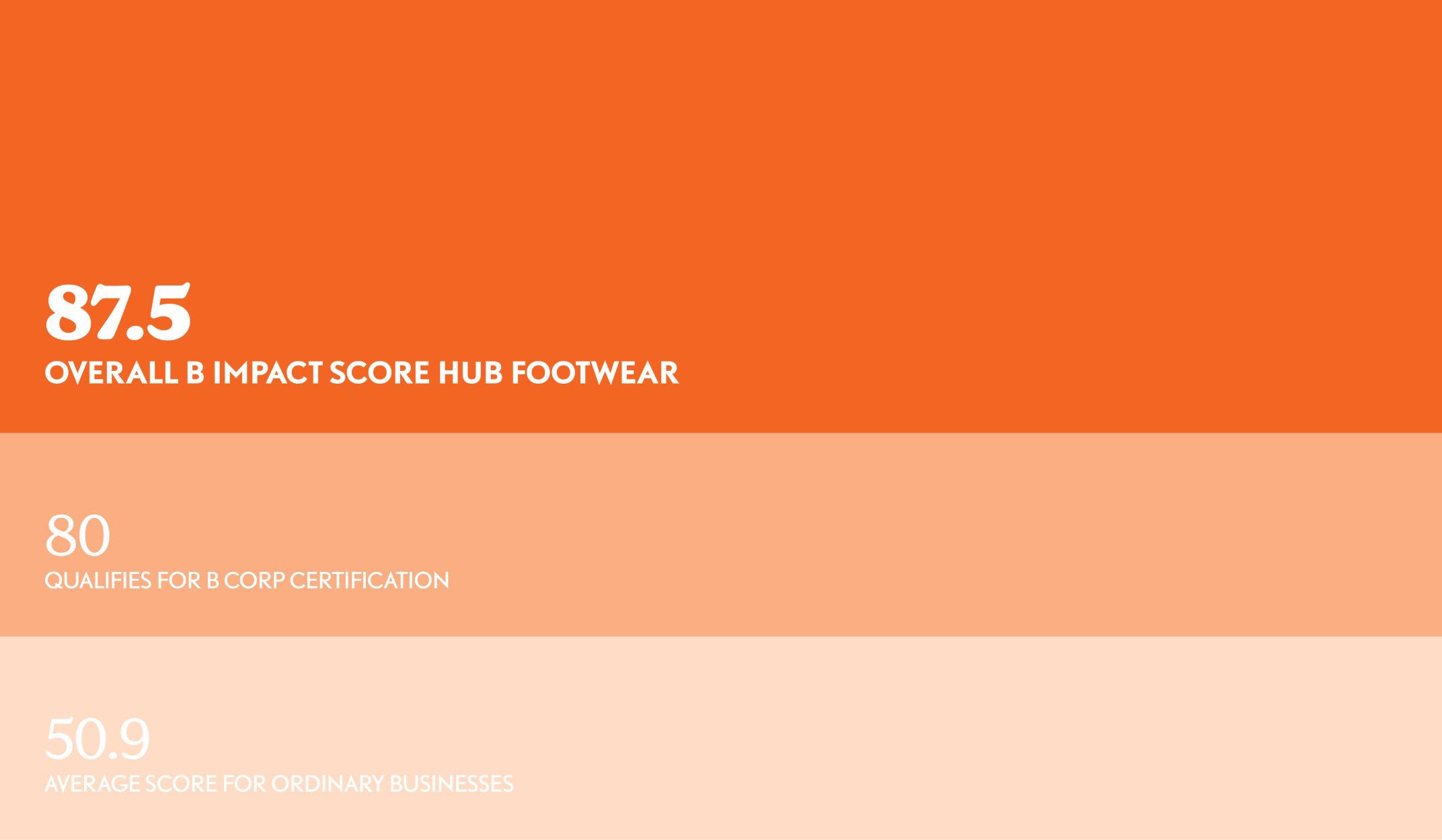 HUB Footwear ist ab sofort stolz B Corp-zertifiziert . Diese Zertifizierung ist ein Beleg für unser unerschütterliches Engagement für Transparenz, Nachhaltigkeit und soziale Verantwortung. Sie bedeutet, dass unser Handeln den höchsten Standards an geprüfter Leistung, Verantwortlichkeit und Transparenz entspricht und wir die Auswirkungen unserer Entscheidungen auf unsere Mitarbeiter, Kunden, Lieferanten, die Gemeinschaft und die Umwelt berücksichtigen.