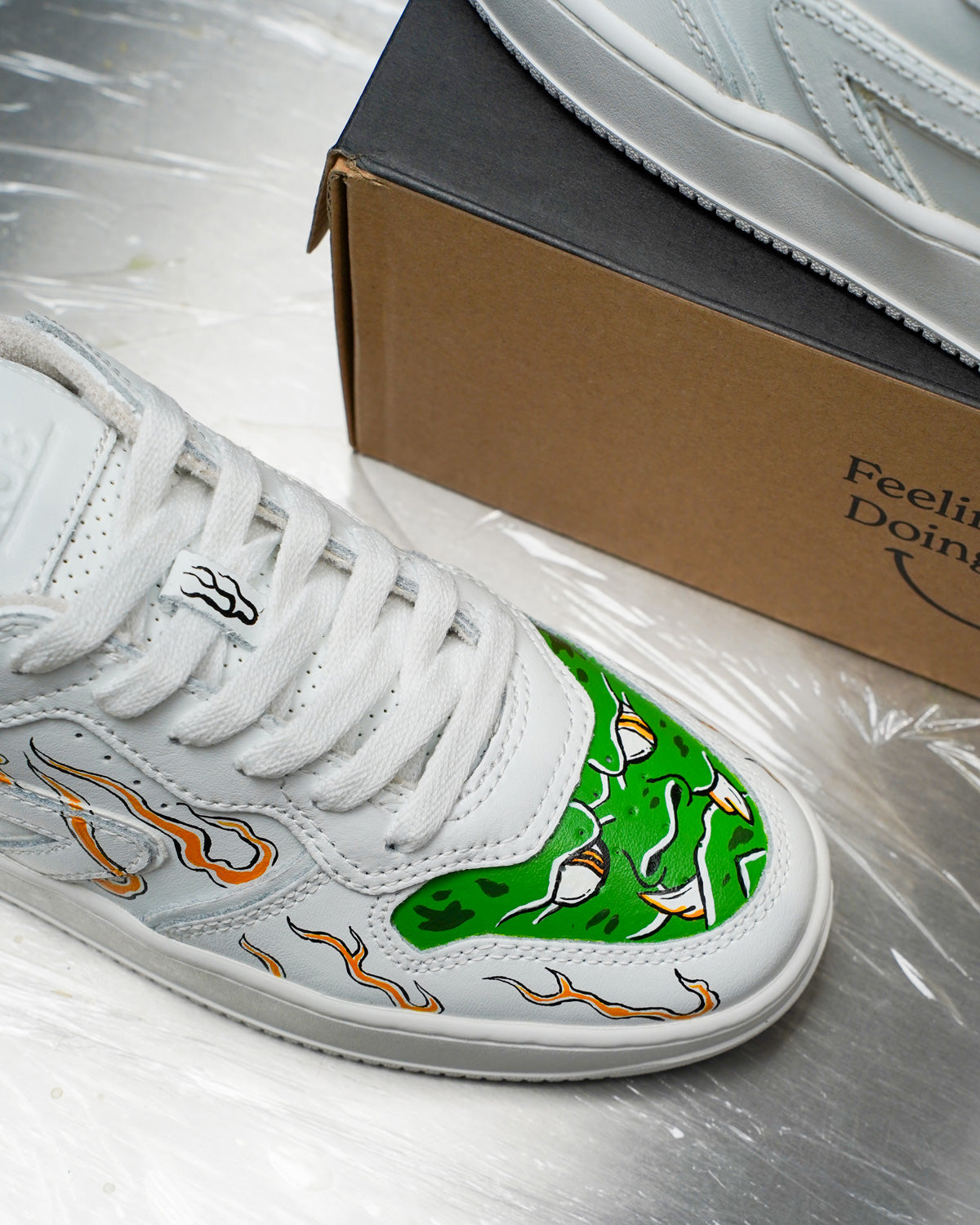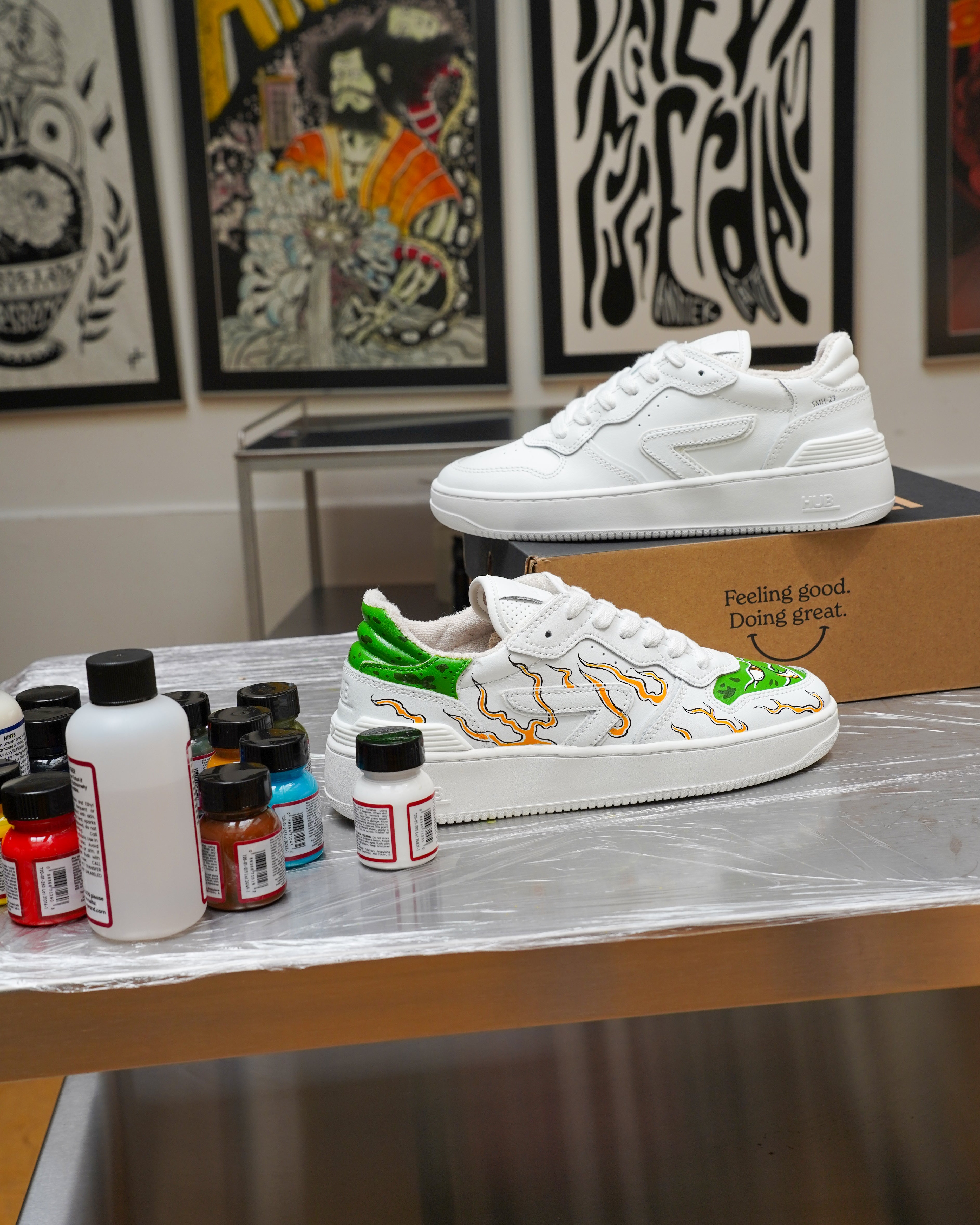 This one of a kind women’s Smash sneaker is part of the HUB Footwear x Hartstichting collaboration. Tattoo artist La Dorada customized this pair with bold, hand-painted flames and striking green details, turning the classic silhouette into a powerful statement piece.