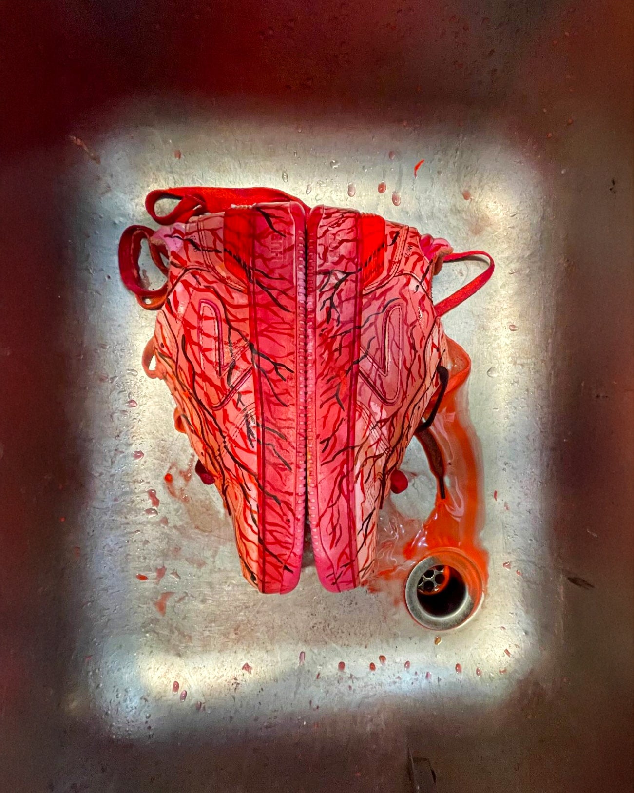 This one of a kind sneaker art piece is part of the HUB Footwear x Hartstichting collaboration. Created by artist Nick Kailola, it transforms the sneaker into a sculptural object with hand-painted veins, layered textures, and flowing laces that evoke the intricate pathways of the human heart.